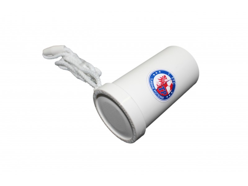 Eine kleine weiße Tröte mit dem Vereinslogo in einer Durchmesser Größe von 2,5 cm.