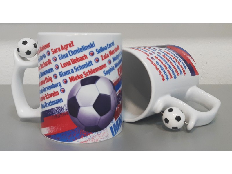 Tasse mit Fußball am Henkel & allen Namen der Spielerinnen aus der Saison 2020/2021.